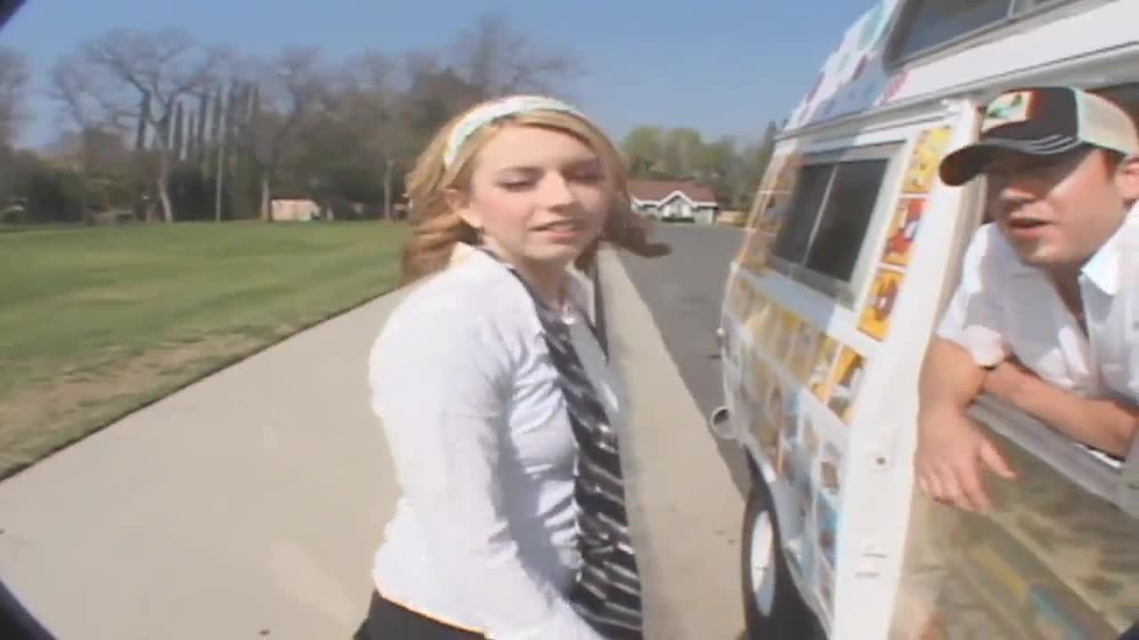 Girl gives ice cream man a peek under her skirt while sitting in the back
